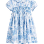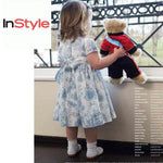 As seen in Vogue Magazine. The sky blue Theodora dress puts a stylish twist on the classic Toile de Jouy. There is no denying that this is the dress for the star of the show! Delicate puffed cap sleeves create a romantic silhouette, while intricate hand smocking and embroidery makes this signature dress one of the most luxurious – if not the most iconic – in the Annafie catalogue! Our dresses are lined in cotton to create a perfect flare for twirling and dancing like everybody’s watching. The Theodora has fabric covered buttons that fasten at the back and an attached sash tie at the waist (12 months+), which is a good test for the best bow-tier in the family. - 100% fine cotton - Machine washable at 30°C - Traditional hand smocking and embroidery - Smocking width increases with dress size