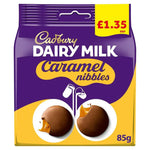 Milk chocolates with a soft caramel centre. Well hello Caramel Nibbles! A bag full of tasty little nibbles, ready for you to pop in your mouth. Still Caramel, just in little nibble-sized bits. Cadbury Dairy Milk and classic Caramel in a bag full of nibble-sized pieces, Ideal for sharing with family and friends, Suitable for vegetarians.
