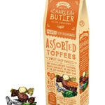 Charles Butler's Assorted Toffees in a 190g box. My discerning customers will never be hornswoggled into eating a Toffee of inferior quality. Made with only the finest ingredients my assortment of finest Toffees cannot be beaten! My boxes are 190g of the finest confections and I am selling them as single boxes so you can purchase as many or as few as you would like. Allergens: Milk, Soya. Nutritional Value: "Energy kcal/kj 442/1861 Fat 12.35g of which Saturates 5.9g Carbohydrate 81.4g of which sugars 63.6g Protein 0.9g Salt 0.1g.