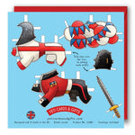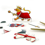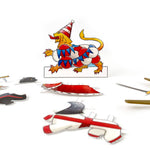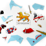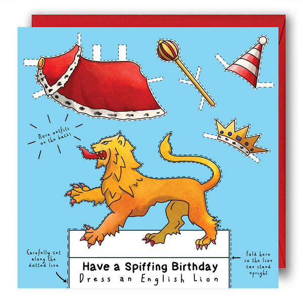 'Dress an English Lion' Birthday cards feature four English themed outfits; a St. George onesie, a Grenadier guard, a Kings cloak and crown and Balloons and bunting. Simply cut around the dotted line and dress the English lion in your favourite!
