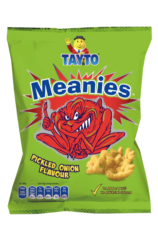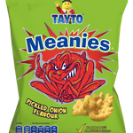 Tayto Mega Meanies Pickled Onion, a childhood favourite that has stood the test of time. These crunchy puffed corn snacks are a nostalgic delight, dusted with a mean pickled onion flavour that will transport you back to the good old days.