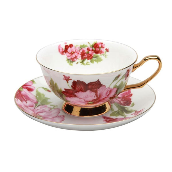 • Radiant Floral Design: Rich red flowers and delicate greenery wrap around the cup and saucer, evoking the charm of an English garden in full bloom.