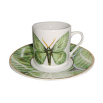 Set of 4 espresso cups and saucers featuring beautiful prints of green butterflies. The porcelain-made espresso cup set comes gift boxed.