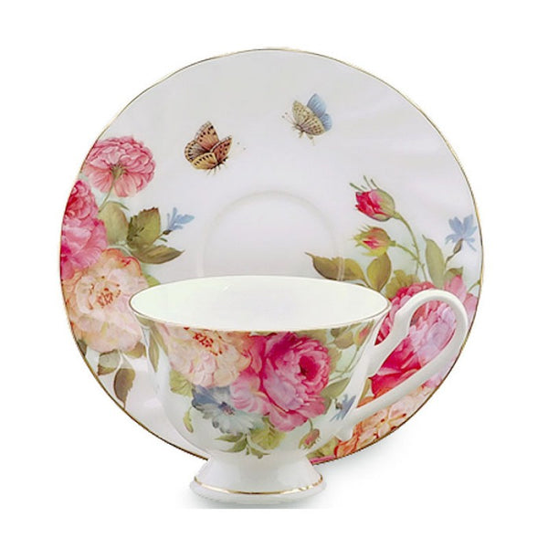 Discover the epitome of grace with Sandra's Rose Tea Cup and Saucer Set. This delicate collection is a symphony of florals and flight, bringing the timeless beauty of an English garden right to your tabletop.