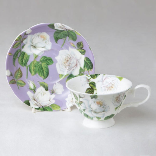 An exquisite set of cups and saucers! The white rose design on the purple bone china is simply delightful. It's a beautiful set that adds a touch of elegance to tea or coffee moments. The quality and design speak volumes of sophistication.