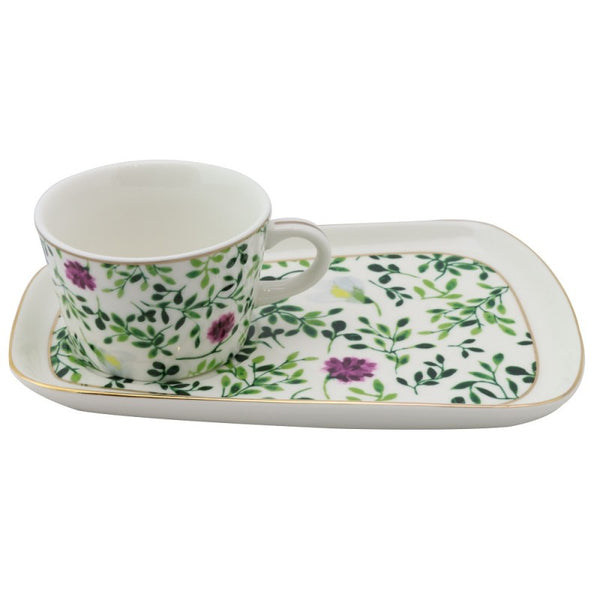 Indulge in the art of leisurely snacking with our Green Leaves Snack Set. Crafted to bring the lush beauty of an English garden to your afternoon tea, this set of two pairs a delightfully patterned cup with a matching tray, evoking the serene elegance of a countryside retreat.