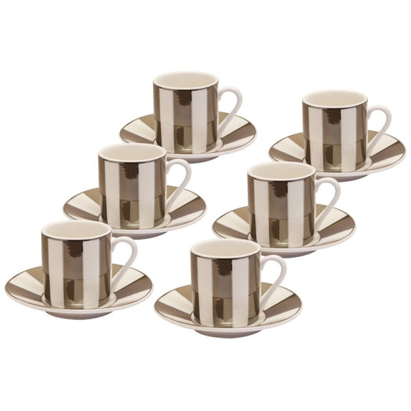 Product Description: Brew a touch of sophistication into your morning routine with the Metallic Pewter Stripe Espresso Set. This chic ensemble of espresso cups and saucers is designed for the connoisseur who appreciates a dash of elegance with their caffeine kick. The sleek pewter stripes offer a modern twist on the classic espresso set, making it a superb addition to any contemporary kitchen or coffee table.