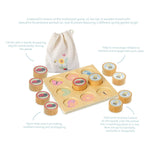 A beautiful version of the traditional game, tic tac toe. A wooden board with beautiful illustrations printed on, and 10 pieces featuring 2 different spring garden bugs! The set comes with a handy drawstring bag for conveniently storing the pieces. Help encourage children to interact and engage with each other with this 2 player game! Teach little ones turn-taking, problem solving & strategising. Take turns to place a piece on the board, until the winnerhas 3 matching pieces in a row. Row can go horizontally, vertically or diagonally. This product is made from FSC® - certified wood. By choosing this product, you are supporting responsible management of the world's forests. This product comes in beautifully designed, fully recyclable packaging.
