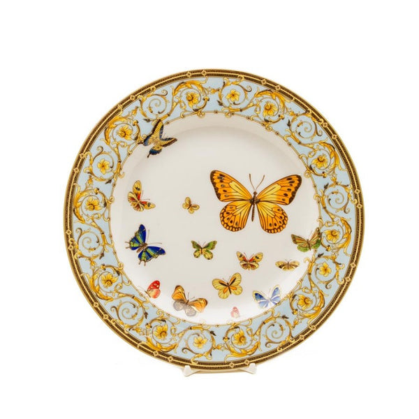 Embark on a visual journey through a garden of elegance with the Blue Butterfly Dessert Plate Collection. Each plate in this set of four is a delicate canvas showcasing vibrant butterflies flitting amongst golden tendrils and floral blooms, bringing the serenity and beauty of nature right to your dining room. These aren't just plates; they're a conversation starter, a piece of art, and a testament to the grace of the natural world.