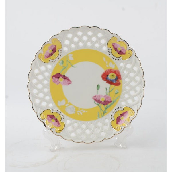 The Poppy Yellow Pieced Salad Plate set is an embodiment of spring's awakening, each piece a canvas showcasing the lush English countryside. The eye-catching floral design, featuring poppies in bloom, transports you to a serene garden with every glance. A sunny yellow rim encircles the artwork, adding a pop of color that complements the natural theme. Not just beautiful, the plate’s intricate lattice edge is reminiscent of a classic English garden's wrought-iron details. Made with the utmost attention to quality, these porcelain plates strike the perfect balance between robustness and refinement. This collection, arriving in a set of four, is perfect for those who appreciate the art of a beautifully set table and the joy of shared meals.