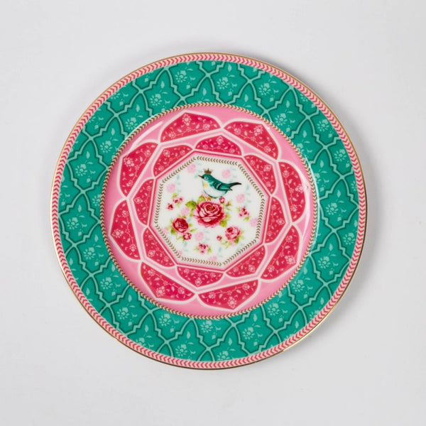 • Exquisite Artistry: At the heart of each plate is a charming blue bird, crowned like royalty amidst a bouquet of roses, with a geometrically patterned border in teal and accents of pink.