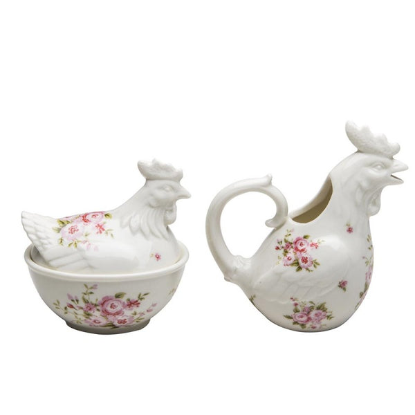 Product Description: Add a peck of pastoral pleasure to your tea-time tradition with our Pink Floral Hen Sugar and Creamer Set. Inspired by the quaint charm of a British country garden, this delightful duo is perfect for those who love their tea served with a side of whimsy. The intricate floral patterns bloom across each piece, reminiscent of an English cottage garden, while the playful hen shapes will have you clucking with joy. It's more than a set; it's a conversation starter that brings a smile to every brew.