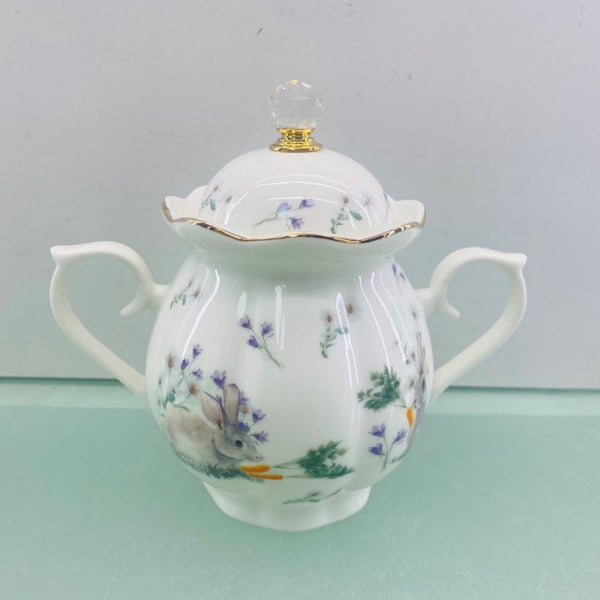 Transport your tea experience to a charming English countryside with the Happy Bunny Sugar Creamer Set. This delightful set, adorned with soft lavender hues and a playful bunny motif, is an ode to the idyllic, pastoral life. It's perfect for those who wish to sip their tea with a touch of whimsy and elegance.