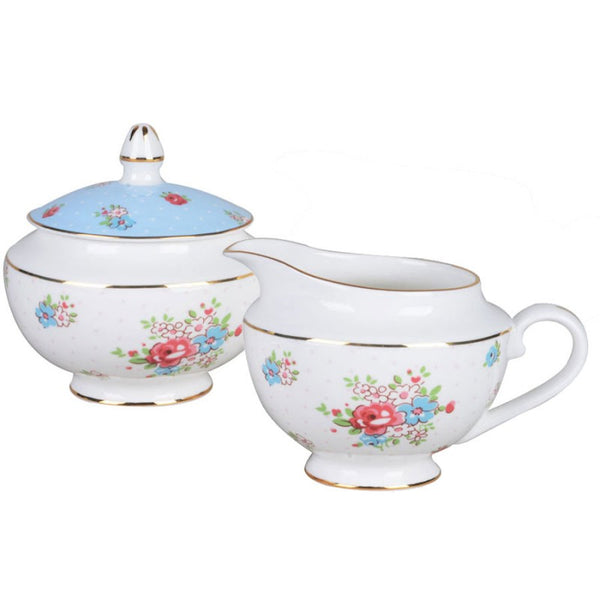 Product Description: Introducing the Katie Rose Blue Sugar and Creamer Set – your new centerpiece for a quintessentially English teatime experience. Each piece in this exquisite set is graced with sprightly floral bouquets, set against a serene blue backdrop that evokes the beauty of a country garden in spring. The elegant design is further accentuated by the gentle sprinkling of gold trim, which adds a dash of opulence to your tea tray. Made from the finest porcelain, this set promises to be as durable as it is beautiful, ready to grace your table for many cups of tea to come.
