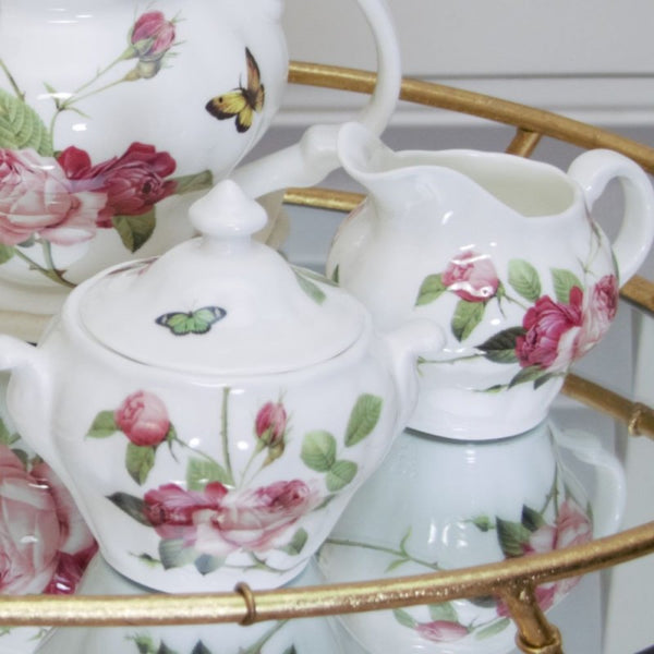 Embrace the quintessence of English tea tradition with the Kensington Pink Rose Sugar and Creamer Set. This enchanting set, adorned with delicate pink roses and fluttering butterflies, promises to add a touch of countryside charm to your tea rituals. Perfect for those who cherish the grace and romance of an English garden.