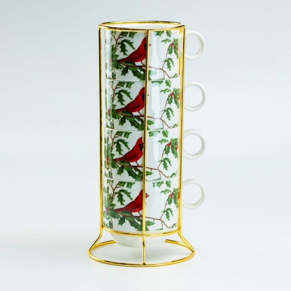Add a touch of nature's splendor to your tea collection with our Cardinal Charm Stacked Mug Tower. This striking set features a quartet of fine china mugs, each adorned with the vibrant image of a cardinal perched amid holly branches. Elegantly stacked within a gleaming golden rack, this ensemble is as decorative as it is functional, bringing a festive spirit to your kitchen or dining room.