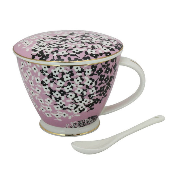 The Spray Ditsy Mug set brings a flourish of floral elegance to your tea-time ritual. With its chic pink background and a scatter of dainty black and white flowers, this three-piece set, complete with a mug, cover, and spoon, is a symphony of style and practicality.