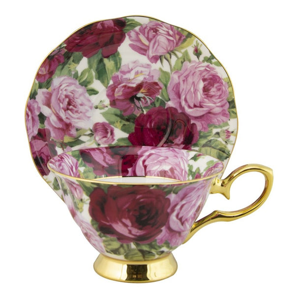 Lush Rose Design: Full-bloom roses in shades of deep crimson and soft pink wrap around the cup and saucer, bringing the opulent beauty of a traditional English garden to your table.