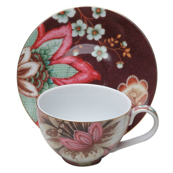 The Lotus Garden Demitasse Cup and Saucer Set is a resplendent homage to the serene and symbolic lotus flower, capturing its essence in a design that is both ornate and tranquil.