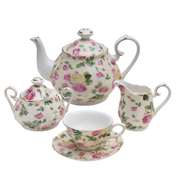 Embark on a delightful journey through a blooming meadow with our Rose Chintz Bouquet Porcelain Tea Set. This exquisite assembly is your ticket to experiencing the quintessentially British pastime, adorned with all the poetic charm of an English garden in full bloom.