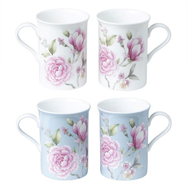 The set features two designs: one, a crisp white background that allows the vibrant pinks and greens of the blooms to stand out; the other, a gentle blue that evokes the clear spring sky. The lush florals wrap around each mug, their petals unfurling gracefully, inviting you to take a moment for yourself with each sip.