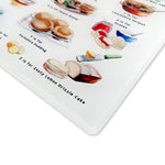 This beautifully illustrated cutting board is proudly printed in the UK. Each board is printed individually, by hand, onto a strong tempered glass board. The surface of the glass has a 'clear' finish rather than 'frosted finish' resulting in a design that has both vibrant colours, and fantastic detail that lasts.