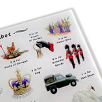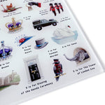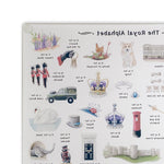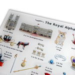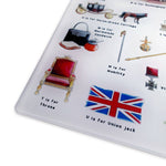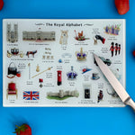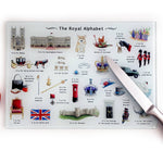 Celebrate the coronation year in style with The Royal Alphabet cutting board. This hand-printed, tempered glass cutting board features all things British and royal, from marmalade sandwiches, to corgis and castles.