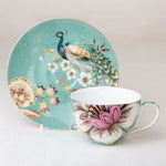 The cup, with its complementary floral design, sits gracefully atop the saucer, its curves inviting the warm embrace of your hands. As you sip your tea, the peacock's tail seems to unfurl, a visual delight that enhances the serenity of your tea time.