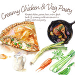 Roasted Chicken, Onion, Carrots, Peas, Leeks, Celery, Potatoes, Herbs de Provence & a Creamy White Wine Sauce in a Buttery Shortcrust Pastry