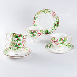 Festive Flair: Each cup and saucer is adorned with bright holly berries and lush green leaves, a classic symbol of holiday joy and gatherings.