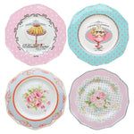 Product Description: Delight in the quaint charm of our Tea Party Dessert Plates, a set of four assorted plates that are as sweet as the treats they're destined to hold. Each plate in the collection tells a story, inviting you to a fanciful world of tea-time joy. From the delicate pink of a cherry-topped pavlova to the soft blue of a scrumptious ice cream sundae, these plates are a call to sit back, relax, and indulge in the pleasure of good company and delectable desserts.