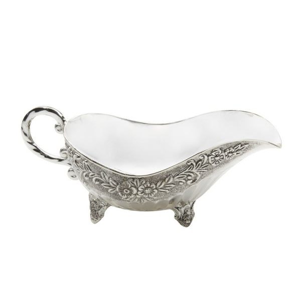 "Refined Elegance: Silver-Plated Gravy Boat with Antique Floral Design"