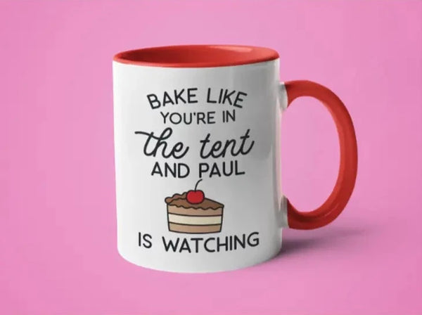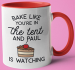 Funny baking mug features the phrase 'Bake Like You're In the Tent and Paul is Watching'. Makes a great gift for anyone who loves British Bakeoff! Makes a great birthday or Christmas gift!