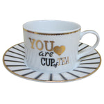 Product Description: Introducing the Metallic Stripe Cup and Saucer Set – the epitome of modern sophistication blended with a dash of love. This charming set marries the timeless ritual of tea drinking with contemporary design elements, featuring bold metallic stripes and a heartwarming message that's sure to bring a smile with every sip. Perfect for those moments when you want to express your affection or simply enjoy a quiet cuppa in style.