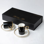 Elevate your coffee ritual with the strikingly sophisticated Black & White Gold Tall Espresso Cups and Saucers set, where classic design meets modern elegance.
