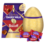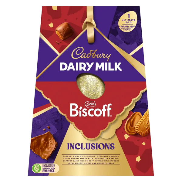 A delicious, creamy Cadbury Dairy Milk Easter egg with crunchy Lotus Biscoff pieces and individually wrapped Cadbury Biscoff chunks. Perfect for gifting this Easter!
