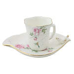 Elegant Songbird Motif: Each cup and saucer is adorned with a charming illustration of a songbird perched amidst blooming roses, invoking the serenity of nature.