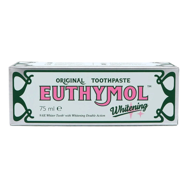 Euthymol Whitening Toothpaste 75ml removes and prevents surface satins 9.6 times more effectively for brighter teeth. Its whitening double action removes existing stains and prevents new ones. Freshens breath for up to 12 hours. Its whitening essence particles provide a crunchy texture and refreshing experience.