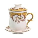 This is a four-piece Tea Mug made of fine-grade porcelain. The tea mug measures around 5 inches in height. The strainer adds convenience for your solitary tea times and makes this a perfect go for your Tea for Me sessions!