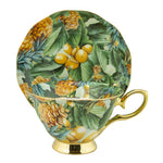This single teacup and saucer set is not just a vessel for your favorite brew but a statement of exquisite taste. The fine bone china provides the perfect canvas for the vibrant tropical print, bringing a piece of the exotic to the comfort of your home. The golden pinecones add a touch of autumnal warmth, while the lemons bring a zesty freshness, creating a harmonious balance between the seasons.