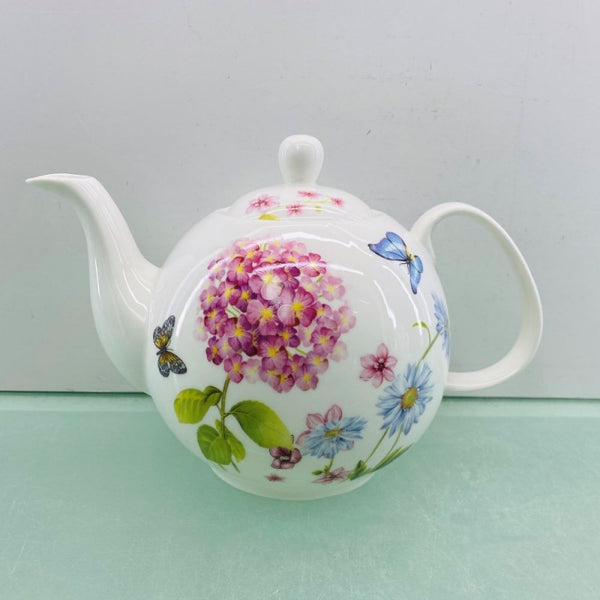 Delight in the charm of the Hydrangea Garden Bone China Teapot, a lovely addition to any tea lover's collection. Adorned with lush hydrangea blooms and fluttering butterflies, this teapot is a true embodiment of nature's beauty.