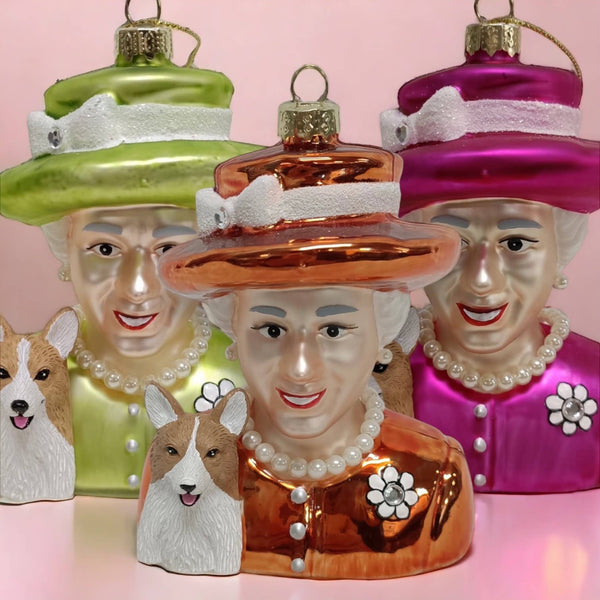 Queen Elizabeth in glossy orange, green dress and fuchsia dress. Carefully hand-painted with attention to the smallest detail. Designed to be truly collectible. Each ornament is crafted with care. Beaded and glittered. Handmade item. Part of the "women we admire" collection. Size: 5"x3.5"x1.5".