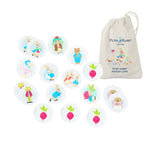 A beautiful Peter Rabbit version of a memory game. A cavas bag of wooden pieces each with beautiful illustrations printed on. Turn over each piece and try to find the ones that match! The set comes with a handy drawstring bag for conveniently storing the pieces.
