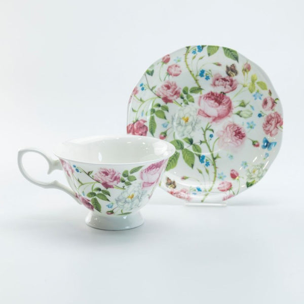 The Garden Splendor Teacup and Saucer Set invites you to savor your tea amidst the bounty of a blooming garden. The delicate artwork, featuring roses in shades of pink, is beautifully contrasted against the crisp white china, making every petal and leaf pop with life-like vibrancy.