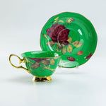 Indulge in the Luxe Splendor of the Green and Red Rose Gold Tea Cup and Saucer