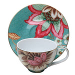 Introducing the Teal Lotus Garden Demitasse Cup & Saucer Set, an exquisite marriage of Eastern elegance and Western charm. This set is a true gem for any tea or coffee aficionado, featuring a vibrant teal backdrop adorned with the sublime beauty of the lotus flower.