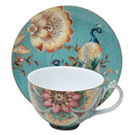 Delve into the opulent world of the Teal Peacock Lotus Garden Latte Cup & Saucer Set. Drawing inspiration from the majestic beauty of peacocks and the serene charm of lotus blooms, this set is an ode to the grandeur of nature, exquisitely rendered on fine porcelain.