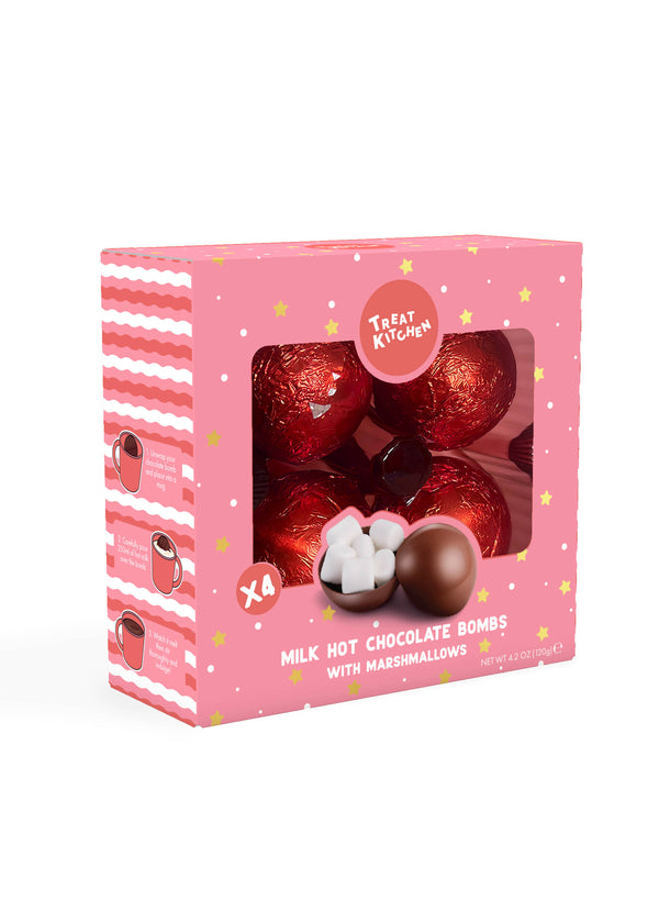 New for AW24! Make your winter nights warmer and yummier! Indulge in our decadent hot chocolate bombs that promise an explosion of flavour and comfort. Simply dunk them into hot milk and witness the magic as the smooth milk chocolate melts away, releasing a cascade of mini marshmallows. Each gift pack contains four milk chocolate bombs, filled with marshmallows, ready to make your hot chocolate dreams come true.