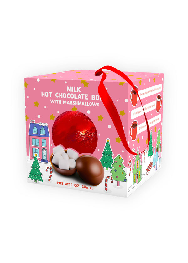 New for AW24! Make your winter nights warmer and yummier! Indulge in our decadent hot chocolate bombs that promise an explosion of flavour and comfort. Simply dunk them into hot milk and witness the magic as the smooth milk chocolate melts away, releasing a cascade of mini marshmallows. Each gift pack contains one milk chocolate bombs, filled with marshmallows, ready to make your hot chocolate dreams come true.