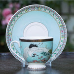 - Each cup and saucer features a hand-painted turquoise background, setting a tranquil scene for the majestic crane amongst the pine trees.